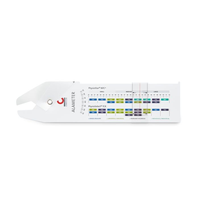 De Alameter is een handig hulpmiddel om de juiste tandvorm van PhysioSet® TCR Resin en PhysioSet® CT Porcelain te bepalen. Uit jarenlange ervaring is gebleken dat er een verband bestaat tussen de neusvleugelbreedte en de tandvorm van de patiënt. De Alameter meet de neusbreedte en berekent automatisch de ideale tandvorm.
