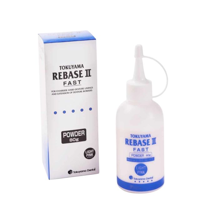 Rebase II is een kunststof voor directe, harde rebasingen en reparaties. Inhoud: 80g poeder, 50mL vloeistof, 15 ml Adhesief en 1x Tokuso Resin Hardener II.