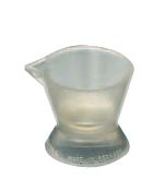 Mengbeker van helder silicone, stevige stand door stabiele zuignapvoet. Praktische giettuit bij middelgrote en grote uitvoering.