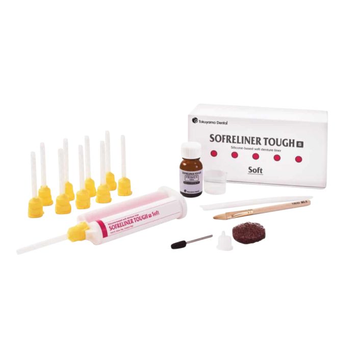 SOFRELINER TOUGH S is een zelfpolymeriserend, ultrazacht reliningmateriaal op siliconebasis voor het relinen van partiële of volledige protheses geschikt voor gebruik aan de stoel. Indicaties: pijn veroorzaakt door scherpe alveolaire botranden en slijmvliesatrofie, slechte retentie veroorzaakt door uitzonderlijke atrofie van de kaak, grote ondersnijdingen of maxillaire / mandibulaire tori, retentie van overkappingsprothesen voordat de uiteindelijke suprastructuur is geplaatst en tijdelijke nieuwe voering of tissueconditioning.